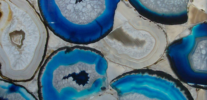 BLUE AGATE. L'Agata è una varieta' di Calcedonio semitrasparente e durissimo; si presenta a bande colorate sfumate dello stesso colore o in colori contrastanti, ondulate o concentriche, che vanno dal bianco al grigio, nero, azzurro, rosso, bruno, verde. Questa pietra dal grande potere curativo, oltre ad infondere senso di forza e coraggio, tonifica e rinforza il corpo mentale e facilita l'abilita' di discernere la verita' e accettare le circostanze. Il suo nome deriva dal greco "Achates", dal fiume della Sicilia presso il quale anticamente la si trovava in abbondanza; i principali giacimenti sono oggi situati nel Sud America. È accertato che già 5.000 anni fa l'agata era impiegata sia per le sue qualità terapeutiche, sia come elemento decorativo e sacro. Citiamo in merito il vasto impiego per la produzione di scarabei e cammei (come quelli di Marco Aurelio e della Sainte-Chapelle, raffigurante Sapore mentre fa prigioniero Valeriano) ed il famosissimo calice di Tolomeo. Nel mondo islamico questa pietra ha un posto di assoluto prestigio, si narra la leggenda che il profeta Maometto portasse sempre un anello d'agata arancio con incisi i versetti della massima devozione ad Allah.