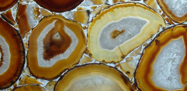 GOLDEN AGATE. L'Agata è una varieta' di Calcedonio semitrasparente e durissimo; si presenta a bande colorate sfumate dello stesso colore o in colori contrastanti, ondulate o concentriche, che vanno dal bianco al grigio, nero, azzurro, rosso, bruno, verde. Questa pietra dal grande potere curativo, oltre ad infondere senso di forza e coraggio, tonifica e rinforza il corpo mentale e facilita l'abilita' di discernere la verita' e accettare le circostanze. Il suo nome deriva dal greco "Achates", dal fiume della Sicilia presso il quale anticamente la si trovava in abbondanza; i principali giacimenti sono oggi situati nel Sud America. È accertato che già 5.000 anni fa l'agata era impiegata sia per le sue qualità terapeutiche, sia come elemento decorativo e sacro. Citiamo in merito il vasto impiego per la produzione di scarabei e cammei (come quelli di Marco Aurelio e della Sainte-Chapelle, raffigurante Sapore mentre fa prigioniero Valeriano) ed il famosissimo calice di Tolomeo. Nel mondo islamico questa pietra ha un posto di assoluto prestigio, si narra la leggenda che il profeta Maometto portasse sempre un anello d'agata arancio con incisi i versetti della massima devozione ad Allah.